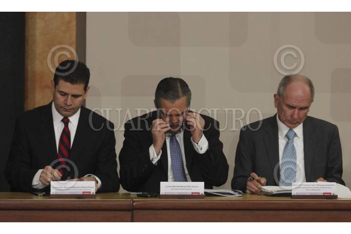 MÉXICO, D.F. 24ENERO2012.- Fernando Toranzo, gobernador de San Luis Potisí, Ruben Moreira, gobernador de Coahuila, Felipe Calderón Hinojosa, presidente de México, Margarita Zavala, esposa del presidente, César Horacio Duarte Jáquez, gobernador de Chihuahua, Jorge Herrera Caldera, gobernador de Durango y Miguel Alonso Reyes, gobernador de Zacatecas, durante la firma del decreto mediante el cual se liberarán los 34 mil millones de pesos de ayuda emergente para los estados afectados por la sequía. FOTO: SAÚL LÓPEZ/CUARTOSCURO.COM