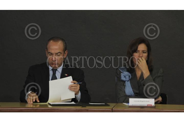 MÉXICO, D.F. 24ENERO2012.- Fernando Toranzo, gobernador de San Luis Potisí, Ruben Moreira, gobernador de Coahuila, Felipe Calderón Hinojosa, presidente de México, Margarita Zavala, esposa del presidente, César Horacio Duarte Jáquez, gobernador de Chihuahua, Jorge Herrera Caldera, gobernador de Durango y Miguel Alonso Reyes, gobernador de Zacatecas, durante la firma del decreto mediante el cual se liberarán los 34 mil millones de pesos de ayuda emergente para los estados afectados por la sequía. FOTO: SAÚL LÓPEZ/CUARTOSCURO.COM