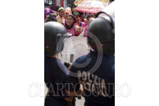 VILLAHERMOSA, TABASCO, 24ENERO2012.- Al menos un centenar y medio de mujeres de bajos recursos económicos de distintas rancherías y ejidos de Macuspana que representan el "Movimiento México Despierta A.C." buscando crear sus propias fuentes de empleo son reprimidas por un grupo de antimotines cuando por medio de la manifestación exigen la entrega del predio urbano de dos hectáreas que meses atrás debió ser entregado. Las amas de casa en su mayoría indígenas también piden ayuda económica en su paso a los automovilistas, y algunos infantes sufren de desmayo a falta de hambre y agua. FOTO: MARCO POLO GUZMÁN HERNÁNDEZ/CUARTOSCURO.COM
