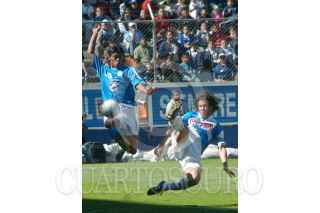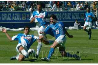 PACHUCA, HIDALGO 09ENERO2004.- El jugador de Puebla disputó un balón con César Delgado en en el partido realizado en la ciudad del torneo cuna de futbol en el que venció cruz azul a Puebla 2 a 1. FOTO: Iván Stephens/CUARTOSCURO.COM