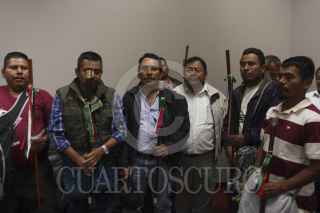 OAXACA, OAXACA, 25ENERO2012.- Uriel Díaz Caballero (al centro con chamarra café), líder del Movimiento Unificador de Lucha Triqui (MULT) posa al lado de agentes y presidentes municipales de la zona triqui, esto previo a la reunión que sostuvieron con el gobernador del estado, Gabino Cué y representantes de la UBISORT y MULTI esto para signar el "Acuerdo de Paz y de Concordia para la Región Triqui". FOTO: ARTURO PEREZ ALFONSO/CUARTOSCURO.COM