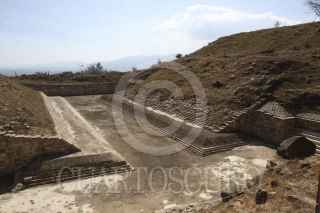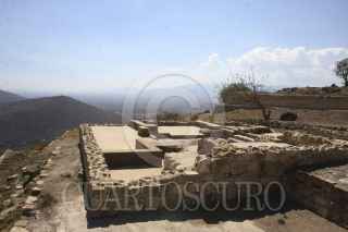 MONTE ALBÁN, OAXACA, 28ENERO2012.- De las dos mil 78 hectáreas que conforman el polígono de Monte Albán, la zona arqueológica más importante de Oaxaca, 400 hectáreas corresponden a la zona de monumentos zapotecas de Atzompa, el delegado del INAH Oaxaca, Eloy Jesús Pérez Sibaja señaló, “es un barrio de los más importantes que tuvo Monte Albán digamos no hay que considerar esto como un espacio aislado a lo que es Monte Albán sino que es parte de este sistema cultural que se han generado en estos emplazamientos”. Hoy se sabe, gracias al descubrimiento de un horno de 1300 años de antigüedad, que este lugar fue habitando por alfareros porque en su interior se fueron halladas infinidad de vasijas fragmentadas. Entre los hallazgos que comprenden la zona de Atzompa, se cuentan 25 edificios prehispánicos. Entre estos: tres “juegos de pelota”, de los cuales uno mide 45 metros de longitud y supera en tamaño al del centro ceremonial principal de Monte Albán conocido como “Juego de Pelota Grande” que mide 25 metros de largo. FOTO: ARTURO PÉREZ ALFONSO/CUARTOSCURO.COM