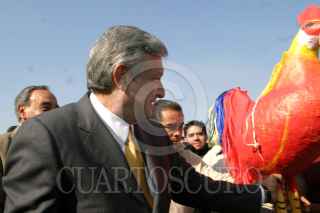 MEXICO, D.F. 10ENERO2005.- Andrés Manuel López Obrador, jefe de gobierno de la ciudad de México, se acerco a un gallo de papel mache que un vecino le acerco durante el recorrido por las nuevas instalaciones de la Universidad de la Ciudad de México, en Iztapalapa. FOTO: Nelly Salas/CUARTOSCURO.COM