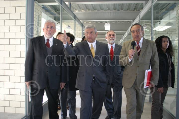 MEXICO, D.F. 10ENERO2005.- Andrés Manuel López Obrador, jefe de gobierno de la ciudad de México, se acerco a un gallo de papel mache que un vecino le acerco durante el recorrido por las nuevas instalaciones de la Universidad de la Ciudad de México, en Iztapalapa. FOTO: Nelly Salas/CUARTOSCURO.COM