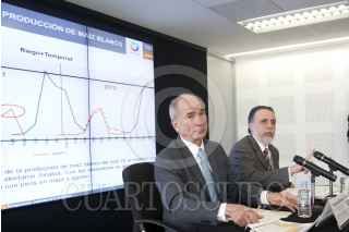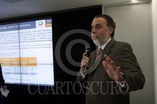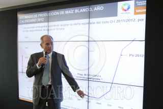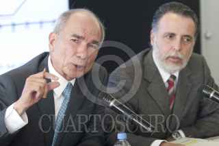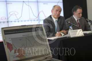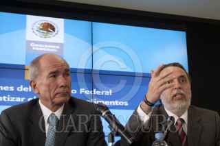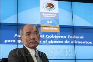MÉXICO, D.F., 31ENERO2012.- Francisco Mayorga Castañeda, titular de la Secretaria de Agricultura, Ganadería, Desarrollo Rural, Pesca y Alimentación (Sagarpa) y Bruno Ferrari, Secretario de Economía (SE), dieron a conocer las acciones del Gobierno Federal para garantizar el abasto de alimentos, esto en las instalaciones de la secretaria de economía. FOTO: GUILLERMO PEREA/CUARTOSCUSRO/COM