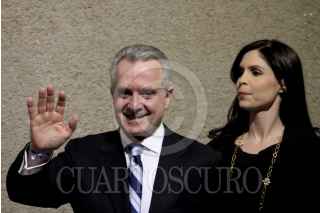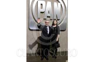 MÉXICO, D.F., 31ENERO2012.- Santiago Creel Miranda, precandidato a la Presidencia de la República, y su esposa Paulina Velasco, llegaron a la sede del PAN en donde se realizó el segundo debate con sus adversarios políticos Josefina Vázquez y Ernesto Cordero, en busca de la candidatura de partido blanquiazul. FOTO: ENRIQUE ORDÓÑEZ/CUARTOSCURO.COM