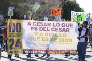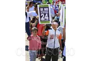 CIUDAD JUÁREZ, CHIHUAHUA, 01FEBRERO2012.- Una gran columna de religiosos de distintas denominaciones, recorrió la mañana de este miércoles calles céntricas de Ciudad Juárez para protestar en contra de la reforma del Artículo 24 constitucional -aprobada por los diputados el 15 de diciembre del año pasado- que concede privilegios a la Iglesia Católica y resta laicidad al Estado mexicano Con grandes mantas al frente con textos como: "Benito Juárez no puede resucitar la lucha ahora es nuestra / Reforma no / Soylaico.org", los varios miles de manifestantes recorrieron la principal avenida 16 de Septiembre para concluir en un mitin en el Monumento a Benito Juárez. FOTO: NACHO RUíZ/CUARTOSCURO.COM