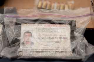 MÉXICO, D.F., 04FEBRERO2012.- En instalaciones de la Policía Federal presentaron a José Antonio Torres Marrufo alías "Marrufo", identificado como líder de la organización conocida como Gente Nueva brazo armado del Cártel del Pacífico al servicio de Joaquín Guzmán Loera. Entre las pertenencias que se le aseguraron fueron dos armas cortas, dos armas largas, droga conocida como "crystal", una camioneta Land Rover, equipo de comunicación y credenciales que lo acerditaban como miembro de la Confederación Internacional de Prensa Mexicana A. C. En esta acción, también se logró la detención de Manuel Alonso Magaña Barajas, de 26 años de edad, originario de Mazatlán, Sinaloa, quien le brindaba seguridad a Torres Marrufo. FOTO: MOISÉS PABLO/CUARTOSCURO.COM
