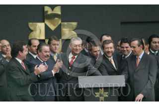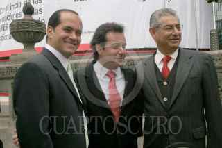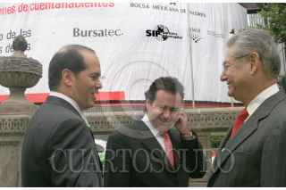 MEXICO D.F 18 ENERO 2005.- Mario Javier Beristain director general de Afore (en medio ) junto con empresarios, dio el timbrazo de inició de Operaciones de las Afores en el Mercado Accionario Mexicano en la sala de operaciones de la Bolsa Mexicana de Valores. FOTO: Eunice Adorno/CUARTOSCURO.COM