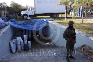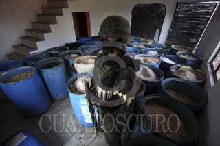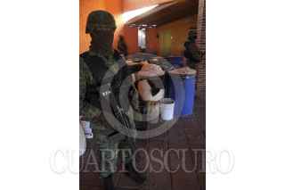 TLAJOMULCO DE ZUÑIGA, JALISCO, 09FEBRERO2012.- Elementos del Ejercito aseguraron un narcolaboratorio en el Rancho el Villarreal, ubicado en Tlajomulco de Zuñiga, mismo que se considera el mas importante en la producción de metanfetaminas, donde aseguraron 15 toneladas de esta sustancia con un valor aproximado de 58 mil millones de pesos, este aseguramiento se realizo tras varias denuncias anónimas y con este narcolaboratorio suman ya siete los asegurados por la Décimo Quinta Zona Militar en lo que va de este año. FOTO: FERNANDO CARRANZA GARCIA/CUARTOSCURO.COM