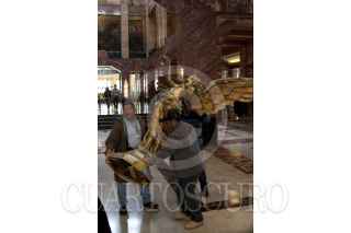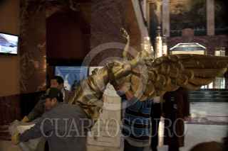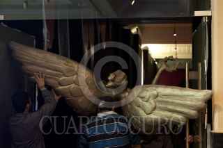 MÉXICO, D.F., 09FEBRERO2012.- Trabajadores de Palacio de Bellas Artes trasladan una replica del icónico Ángel de la Independencia, que en realidad es una Victoria Alada , tras la conclusión de la conferencia sobre el montaje de “El Lago de los Cisnes” en el Palacio de las Bellas Artes. La coreografía de esta puesta escena esta a cargo de Lev Ivanov y Marius Petipa, con música de Piotr Tchaikovsky, y se estrenará enn la Isleta del Viejo Lago de Chapultepec. El espectáculo único en el mundo, ofrecerá 22 funciones en esta temporada, la cual irá del 24 de febrero al 25 de marzo, anunció Sylvie Reynaud directora de la Compañía Nacional de Danza del Instituto Nacional de Bellas Artes. FOTO: MOISÉS PABLO/CUARTOSCURO.COM