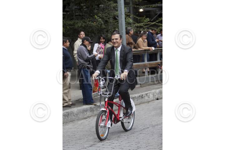 MÉXICO, D.F., 16FEBRERO2012.- Marcelo Ebrard, Jefe de Gobierno, paseo en bicicleta durante la ceremonia del 2 Aniversario de Ecobici, en el Bosque de Chapultepec. Este sistema es para el préstamo de bicicletas y que los ciudadanos puedan hacer viajes cortos por medio de suscripción anual. FOTO: MOISÉS PABLO/CUARTOSCURO.COM
