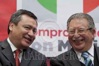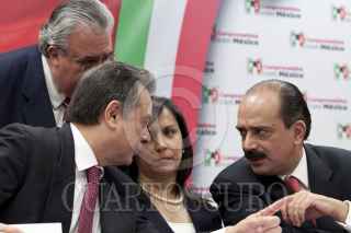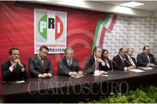 MÉXICO, D.F., 16FEBRERO2012.- Cesar Augusto Santiago, Miguel Ángel Osorio Chong, el diputado Francisco Rojas, el senador Pedro Joaquin Codwell, presidente nacional del PRI; Cristina Díaz, secretaria general del PRI, y los diputados Sebastian Lerdo de Tejada, Eduardo Sanchez Hernandez y Jorge Carlos Ramírez Marín durante una conferencia de prensa que ofrecieron a medios de comunicación en el CEN del PRI. FOTO: RODOLFO ANGULO/CUARTOSCURO.COM