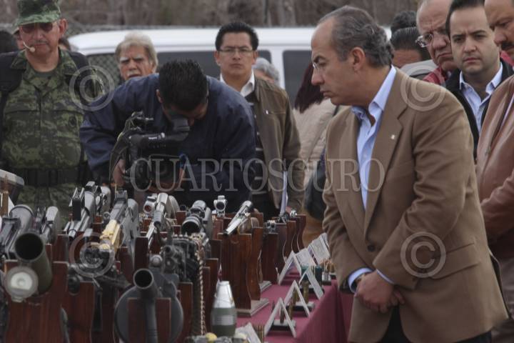 CIUDAD JUAREZ, CHIHUAHUA, 16FEBRERO2012.- Felipe Calderon, Presidente de México y junto a su esposa Margarita Zavala; César Horacio Duarte., gobernador del estado y Guillermo Galván Galván, Secretario de la Defensa durante la supervisión de la desturccion de armas. FOTO: ENRIQUE ORDÓÑEZ/CUARTOSCURO.COM