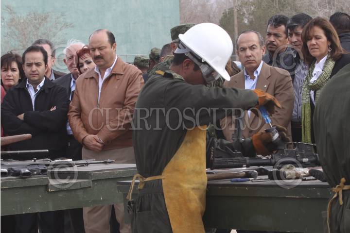 CIUDAD JUAREZ, CHIHUAHUA, 16FEBRERO2012.- Felipe Calderon, Presidente de México y junto a su esposa Margarita Zavala; César Horacio Duarte., gobernador del estado y Guillermo Galván Galván, Secretario de la Defensa durante la supervisión de la desturccion de armas. FOTO: ENRIQUE ORDÓÑEZ/CUARTOSCURO.COM