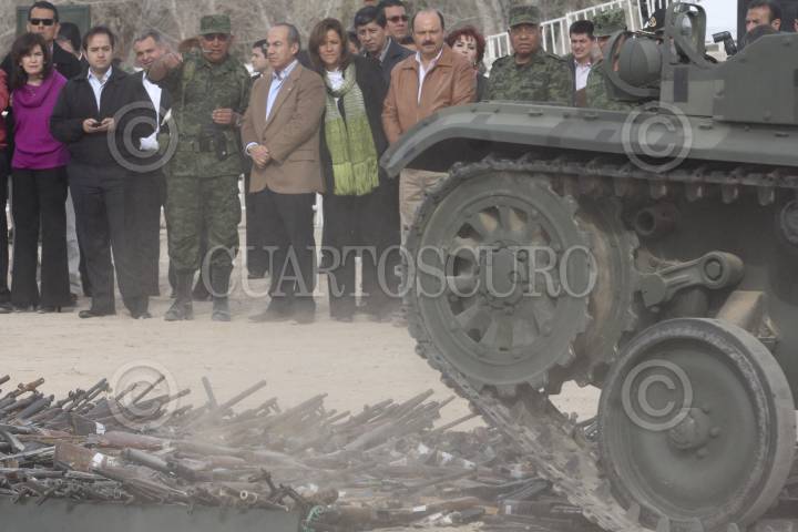 CIUDAD JUAREZ, CHIHUAHUA, 16FEBRERO2012.- Felipe Calderon, Presidente de México y junto a su esposa Margarita Zavala; César Horacio Duarte., gobernador del estado y Guillermo Galván Galván, Secretario de la Defensa durante la supervisión de la desturccion de armas. FOTO: ENRIQUE ORDÓÑEZ/CUARTOSCURO.COM