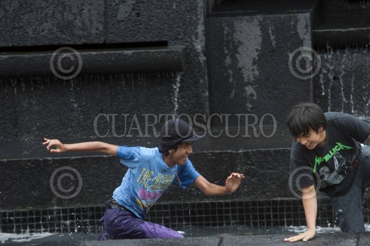 MÉXICO, D.F., 18FEBRERO2012.- Unos jóvenes juegan a aventar a uno de sus compañeros dentro de la fuente, consegido su objetivo el afectado trato de emparejarse. Esto en una fuente del Monumento de la Revolución. FOTO: MOISÉS PABLO /CUARTOSCURO.COM