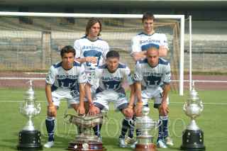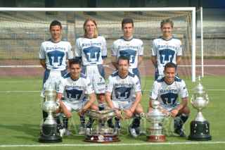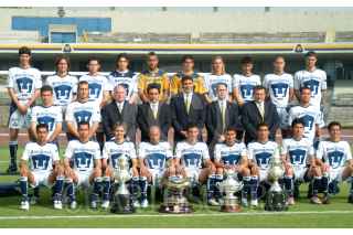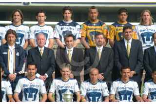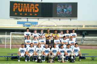 MEXICO, D.F. 20ENERO2005.- El equipo bicampeón del balonpié nacional, Pumas de la Universidad Nacional Autónoma de México (UNAM) se tomaron la fotografía del recuerdo en la cancha del estadio de Ciudad Universitaria. En la gráfica Hugo Sánchez Márquez, Juan Ramón de la Fuente y Arturo Elías Ayub entre otros. FOTO: Iván Stephens/CUARTOSCURO.COM