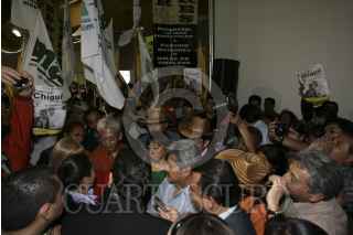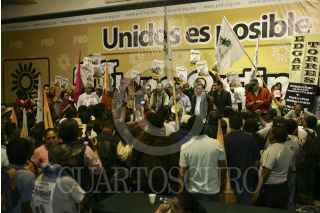 MÉXICO, D.F., 18FEBRERO2012.- Francisco Chiguil, precandidato a la jefatura delegacional de la Gustavo A. Madero, encabezó una tomade tribuna del Consejo Nacional del PRD, el cual se celebra en Expo reforma. El aspirante llegó con un centenar de personas para exigir transparencia en la elección de los candidatos, ya que ellos aseguraron que Chiguil es el mejor posicionado en las encuestas para ser el abanderado por la GAM. FOTO: IVÁN MÉNDEZ /CUARTOSCURO.COM