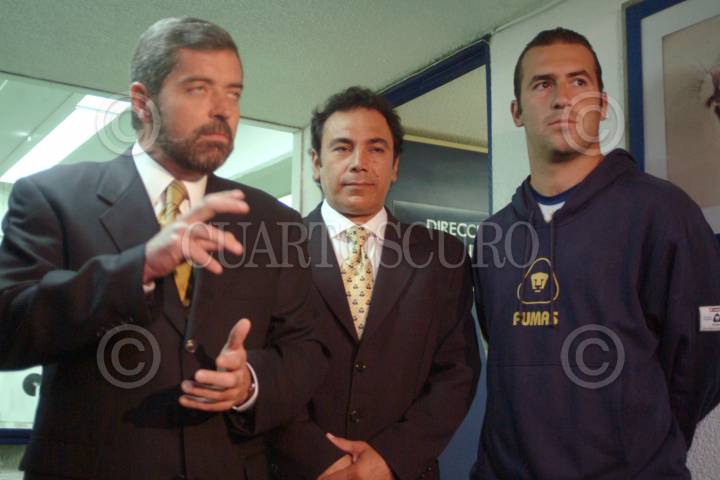 MEXICO, D.F. 20ENERO2005.- El equipo bicampeón del balonpié nacional, Pumas de la Universidad Nacional Autónoma de México (UNAM) se tomaron la fotografía del recuerdo en la cancha del estadio de Ciudad Universitaria. En la gráfica Hugo Sánchez Márquez, Juan Ramón de la Fuente y Arturo Elías Ayub entre otros. FOTO: Iván Stephens/CUARTOSCURO.COM