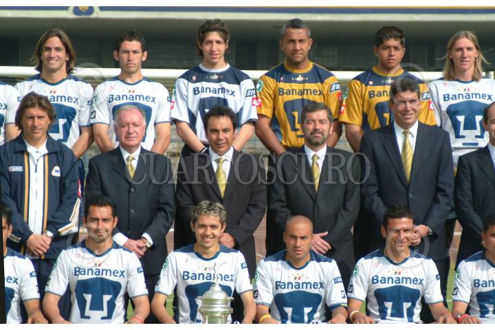 MEXICO, D.F. 20ENERO2005.- El equipo bicampeón del balonpié nacional, Pumas de la Universidad Nacional Autónoma de México (UNAM) se tomaron la fotografía del recuerdo en la cancha del estadio de Ciudad Universitaria. En la gráfica Hugo Sánchez Márquez, Juan Ramón de la Fuente y Arturo Elías Ayub entre otros. FOTO: Iván Stephens/CUARTOSCURO.COM