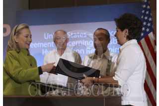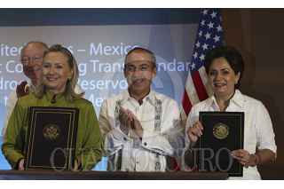MÉXICO, D.F., 20FEBRERO2012.- Felipe Calderón Hinojosa, acompañado de Hillary Clinton, secretaria de Estado de los Estados Unidos y Patricia Espinosa, Secretaria de Relaciones Exteriores de México durante la firma del acuerdo México-Estados Unidos, relativo a yacimientos transfronterizos de hidrocarburos en el Golfo de México. FOTO: ALFREDO GUERRERO/CUARTOSCURO.COM
