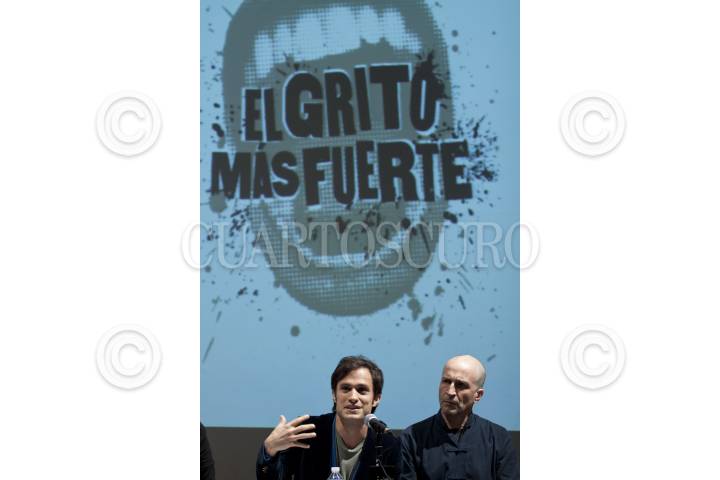 MÉXICO, D.F., 21FEBRERO2012.- El actor Gael Garcia Bernal con algunas de las victimas de la violencia durante la conferencia de prensa en donde se realizo la entrega simbólica del donativo recaudado en el lanzamiento de “En los Zapatos del Otro” que se realizo en el Museo Memoria y Tolerancia. FOTO: RODOLFO ANGULO /CUARTOSCURO.COM