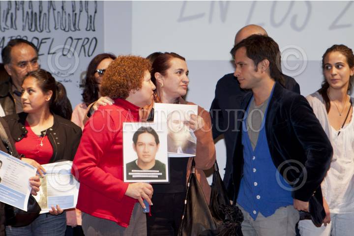 MÉXICO, D.F., 21FEBRERO2012.- El actor Gael Garcia Bernal con algunas de las victimas de la violencia durante la conferencia de prensa en donde se realizo la entrega simbólica del donativo recaudado en el lanzamiento de “En los Zapatos del Otro” que se realizo en el Museo Memoria y Tolerancia. FOTO: RODOLFO ANGULO /CUARTOSCURO.COM