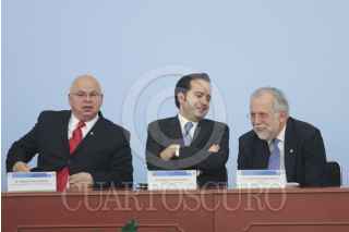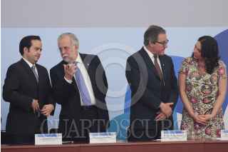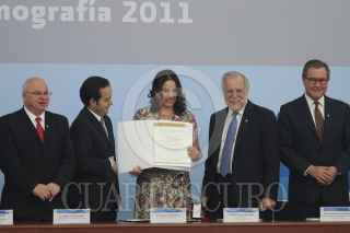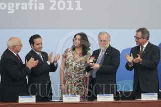MÉXICO, D.F., 22FEBRERO2012.- Alejandro Poire Romero, Secretario de Gobernación, Silvia Giorguli Saucedo, Directora del Centro de Estudios Urbanos y Ambientales del Colegio de México, Javier Garciadiego Dantan, presidente del Colegio de México y Humberto Andrade Quezada, Senador, durante la ceremonia del Premio Nacional de Demografía 2011. FOTO: SAÚL LÓPEZ /CUARTOSCURO.COM