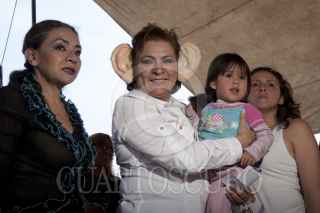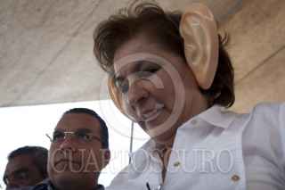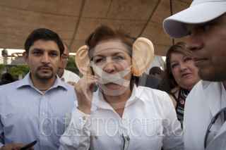 MÉXICO, D.F., 22FEBRERO2012.- Isabel Miranda de Wallace precandidata del PAN al gobierno del D.F. se reunió con vecinos de la colonia Xalpa de la delegación Iztapalapa donde con una diadema con orejas de plástico y una cinta adhesiva en la boca menciono que “estaba ahí para escuchar y no para proponer”. FOTO: GUILLERMO PEREA /CUARTOSCURO.COM