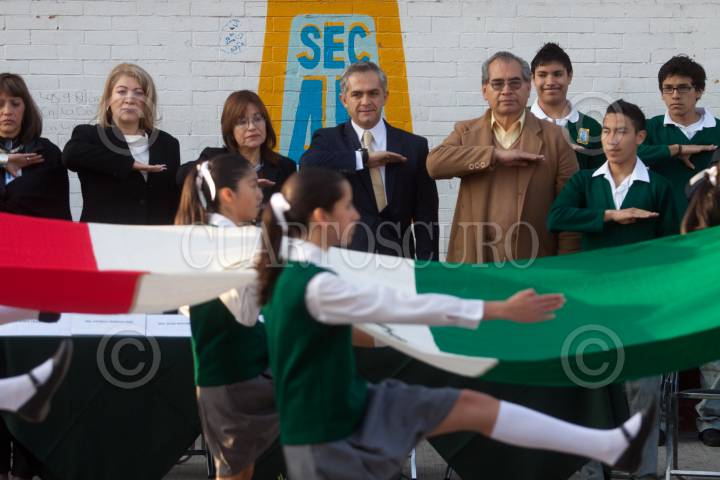 MÉXICO, D.F., 23FEBRERO2012.- Miguel Ángel Mancera, precandidato a la Jefatura de Gobierno por los partidos PRD, PT y Moviento Ciudadano, fue invitado a participar en la ceremonia de honores e izamiento de la bandera en la Escuela Secundaria Diurna 55 "Maria Enrique Camarillo", ubicada en la colonia Narvarte. En esta institución pública el ex-procurador realizó sus estudios como integrante de la generación 78-81 en el grupo D. FOTO: MOISÉS PABLO /CUARTOSCURO.COM