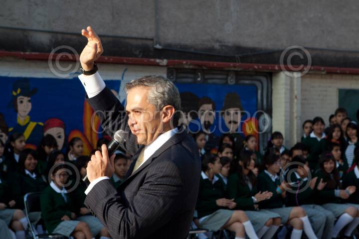 MÉXICO, D.F., 23FEBRERO2012.- Miguel Ángel Mancera, precandidato a la Jefatura de Gobierno por los partidos PRD, PT y Moviento Ciudadano, fue invitado a participar en la ceremonia de honores e izamiento de la bandera en la Escuela Secundaria Diurna 55 "Maria Enrique Camarillo", ubicada en la colonia Narvarte. En esta institución pública el ex-procurador realizó sus estudios como integrante de la generación 78-81 en el grupo D. FOTO: MOISÉS PABLO /CUARTOSCURO.COM