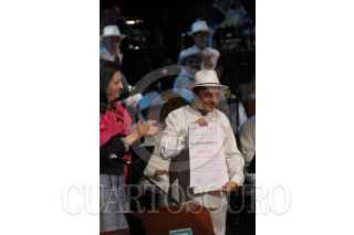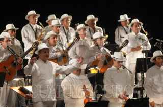 MÉXICO, D.F. 23FEBRERO2012.- La Orquesta Típica de YukalPetén celebró su LXX aniversario con un concierto en el Palacio de Bellas Artes la noche de hoy, además fue galardonada con una mención especial por parte de las autoridades de cultura y su director, Pedro Carlos Herrera fue abanderado con el estandarte de Embajadores del Mundo Maya por el Gobierno del Estado de Yucatán. Tuvo una participación especial el maestro Armando Manzanero. FOTO: FRANCISCO RODRÍGUEZ /CUARTOSCURO.COM