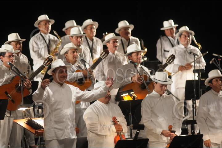 MÉXICO, D.F. 23FEBRERO2012.- La Orquesta Típica de YukalPetén celebró su LXX aniversario con un concierto en el Palacio de Bellas Artes la noche de hoy, además fue galardonada con una mención especial por parte de las autoridades de cultura y su director, Pedro Carlos Herrera fue abanderado con el estandarte de Embajadores del Mundo Maya por el Gobierno del Estado de Yucatán. Tuvo una participación especial el maestro Armando Manzanero. FOTO: FRANCISCO RODRÍGUEZ /CUARTOSCURO.COM