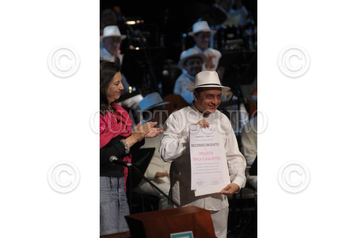 MÉXICO, D.F. 23FEBRERO2012.- La Orquesta Típica de YukalPetén celebró su LXX aniversario con un concierto en el Palacio de Bellas Artes la noche de hoy, además fue galardonada con una mención especial por parte de las autoridades de cultura y su director, Pedro Carlos Herrera fue abanderado con el estandarte de Embajadores del Mundo Maya por el Gobierno del Estado de Yucatán. Tuvo una participación especial el maestro Armando Manzanero. FOTO: FRANCISCO RODRÍGUEZ /CUARTOSCURO.COM