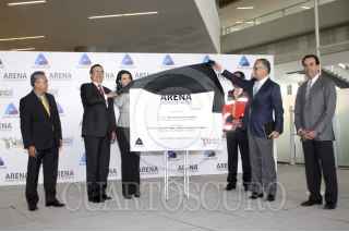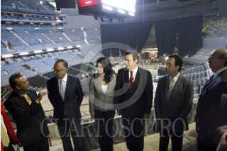 MÉXICO, D.F., 24FEBRERO2012.- Marcelo Ebrard, jefe de gobierno del Distrito Federal acompañado de su esposa Rosalinda Bueso y de Guillermo Salinas Pliego, presidente de Avalanz durante un recorrido y develación de placa de la Arena Ciudad de México que se ubica en Azcapotzalco. FOTO: CUARTOSCURO.COM