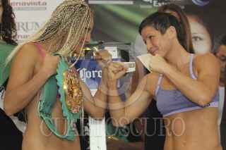 MÉXICO, D.F., 24FEBRERO2012.- Ceremonia de pesaje de Mariana "Barbie" Juarez y la rusa Anastasia Toktaulova por el titulo mundial mosca quienes se enfrentaran este sábado 25 en la Arena México. FOTO: IVAN MENDEZ /CUARTOSCURO.COM