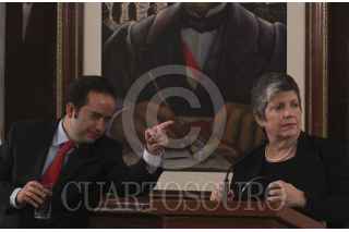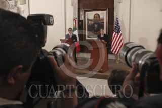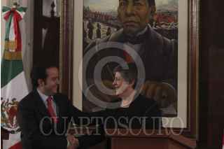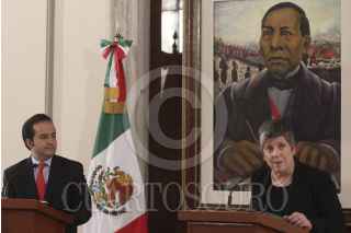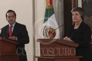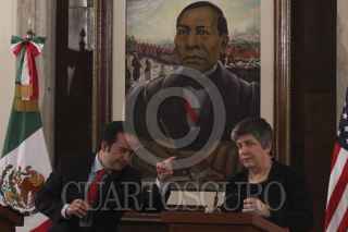 MÉXICO, D.F., 27FEBRERO2012.- Alejandro Poire, Secretario de Gobernación en compañía de Janet Napolitano, Secretaria de Seguridad Interna de Estados Unidos durante el mensaje conjunto que realizaron ante los medios de comunicación donde ratificaron el trabajo conjunto que realizaran para combatir la inseguridad entre ambos países. FOTO: ENRIQUE ORDÓÑEZ /CUARTOSCURO.COM