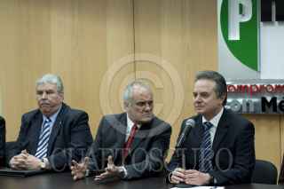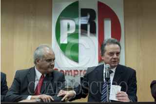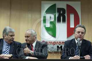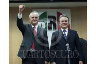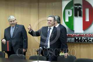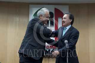 MÉXICO, D.F., 28FEBRERO2012.- Juan Ignacio Torres, precandidato a la gubernatura de Guanajuato, se despide de Emilio Gamboa Patrón, dirigente del CNOP, al finalizar la conferencia de prensa en la cual se hizo el destape del precandidato guanajuatense. FOTO: MOISÉS PABLO /CUARTOSCURO.COM