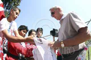 ZAPOPAN, JALISCO, 28FEBRERO2012.- El equipo del Guadalajara entreno en las instalaciones de Verde Valle en donde estuvieron presentes el dueño y presidente del equipo de Chivas, Jorge Vergara Madrigal, así como la leyenda del fútbol mundial y asesor Johan Cruyff, quienes charlaron con el ex- técnico Jose Luis "Guero" Real. El holandes regalo unos autógrafos a los aficionados que se dieron cita. FOTO: FERNANDO CARRANZA GARCÍA /CUARTOSCURO.COM
