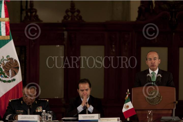 MÉXICO, D.F. 29FEBRERO2012.- El presidente Felipe Calderón acompañado de Genaro García Luna, secretario de Seguridad Pública; Guillermo Galván, secretario de la Defensa Nacional; Alejandro Poiré secretario de Gobernación; José Gonzalez Morfin, presidente de la mesa directiva del Senado de la República, José Francisco Saynez, secretario de Marina y Maricela Morales Ibañez, procuradora general de la República durante la XXXII Sesión del Consejo Nacional de Seguridad Pública que se realizo en el Salón Tesorería de Palacio Nacional. FOTO: RODOLFO ANGULO /CUARTOSCUO.COM
