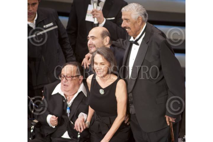 MÉXICO, D.F., 29FEBRERO2012.- Ruben Aguirre, Roberto Gómez Bolaños, "Chespirito" Marco Antonio Regil y Edgar Vivar conviven al finalizar el homenaje que la empresa Televisa le rindió la tarde de hoy en el Auditorio Nacional. FOTO: SARA ORTÍZ /CUARTOSCURO.COM