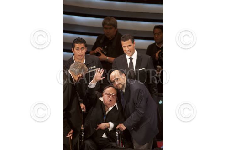 MÉXICO, D.F., 29FEBRERO2012.- Ruben Aguirre, Roberto Gómez Bolaños, "Chespirito" Marco Antonio Regil y Edgar Vivar conviven al finalizar el homenaje que la empresa Televisa le rindió la tarde de hoy en el Auditorio Nacional. FOTO: SARA ORTÍZ /CUARTOSCURO.COM