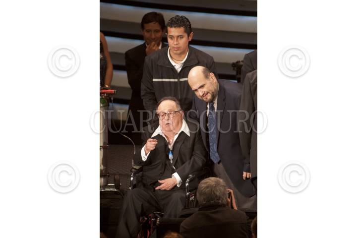 MÉXICO, D.F., 29FEBRERO2012.- Ruben Aguirre, Roberto Gómez Bolaños, "Chespirito" Marco Antonio Regil y Edgar Vivar conviven al finalizar el homenaje que la empresa Televisa le rindió la tarde de hoy en el Auditorio Nacional. FOTO: SARA ORTÍZ /CUARTOSCURO.COM