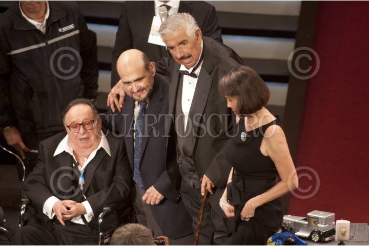 MÉXICO, D.F., 29FEBRERO2012.- Ruben Aguirre, Roberto Gómez Bolaños, "Chespirito" Marco Antonio Regil y Edgar Vivar conviven al finalizar el homenaje que la empresa Televisa le rindió la tarde de hoy en el Auditorio Nacional. FOTO: SARA ORTÍZ /CUARTOSCURO.COM