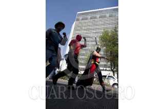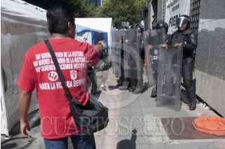 MÉXICO D.F. 01MARZO2012.- Martín Esparza Secretario General del Sindicato Mexicano de Electricistas, dio a conocer los detalles del ingreso de la queja ante la Comisión Nacional de Derechos Humanos contra la Junta Especial número cinco de la Junta Federal de Conciliación y Arbitraje (JFCA) y denuncio la llegada de elementos de la Policía Federal con armas de alto calibre a los plantones que mantiene a las afueras de las instalaciones de la Comisión Federal de Electricidad en avenida paseo de la Reforma e Insurgentes así como en Río Ruedano y Río Atoyac, en la delegación Cuauhtémoc. Al termino de la conferencia encabezo una marcha alrededor de estás instalaciones. FOTO: GUILLERMO PEREA /CUARTOSCURO.COM