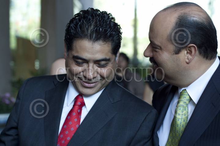 MÉXICO, D.F., 02MARZO2012.- Fernando Toranzo Fernández, gobernador de San Luis, Jorge Herrera Caldera, gobernador de Durango, César Horacio Duarte Jáquez, gobernador de Chihuahua y Oscar Lara Arechiga, presidente de la Comisión de Asuntos Hidráulicos del Congreso de la Unión, durante la segunda reunión extraordinaria de la Comisión de Agua de la Conago. El titular de la comisión del agua, José Luis Luege Tamargo, llegó tarde a la reunión. FOTO: MOISÉS PABLO /CUARTOSCURO.COM