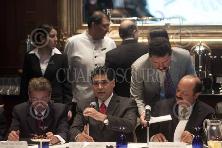 MÉXICO, D.F., 02MARZO2012.- Fernando Toranzo Fernández, gobernador de San Luis, Jorge Herrera Caldera, gobernador de Durango, César Horacio Duarte Jáquez, gobernador de Chihuahua y Oscar Lara Arechiga, presidente de la Comisión de Asuntos Hidráulicos del Congreso de la Unión, durante la segunda reunión extraordinaria de la Comisión de Agua de la Conago. El titular de la comisión del agua, José Luis Luege Tamargo, llegó tarde a la reunión. FOTO: MOISÉS PABLO /CUARTOSCURO.COM
