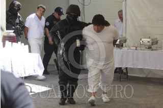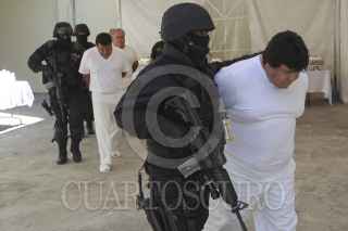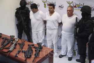 MÉXICO, D.F., 05MARZO2012.- Elementos de la Procuraduria General de Justicia del DF presentaron a tres presuntos integrantes de la organizacion delictiva llamada la mano con ojos los cuales a la hora de su detencion se les encontraron distintas armas de grueso calibre.. FOTO: ENRIQUE ORDÓÑEZ /CUARTOSCURO.COM