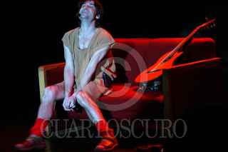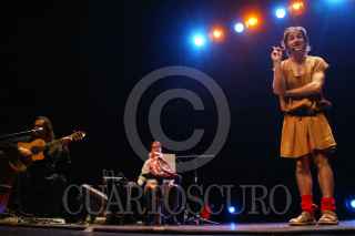 MEXICO D.F. 28ENERO2005.- El cantante catalán Albert Pla en su actuación en el Teatro Helénico durante su gira "Matacerdos" en donde lo acompañan el guitarriata flamenco David Cortés y la actriz Judit Farres. FOTO: Alejandro Meléndez/CUARTOSCURO.COM